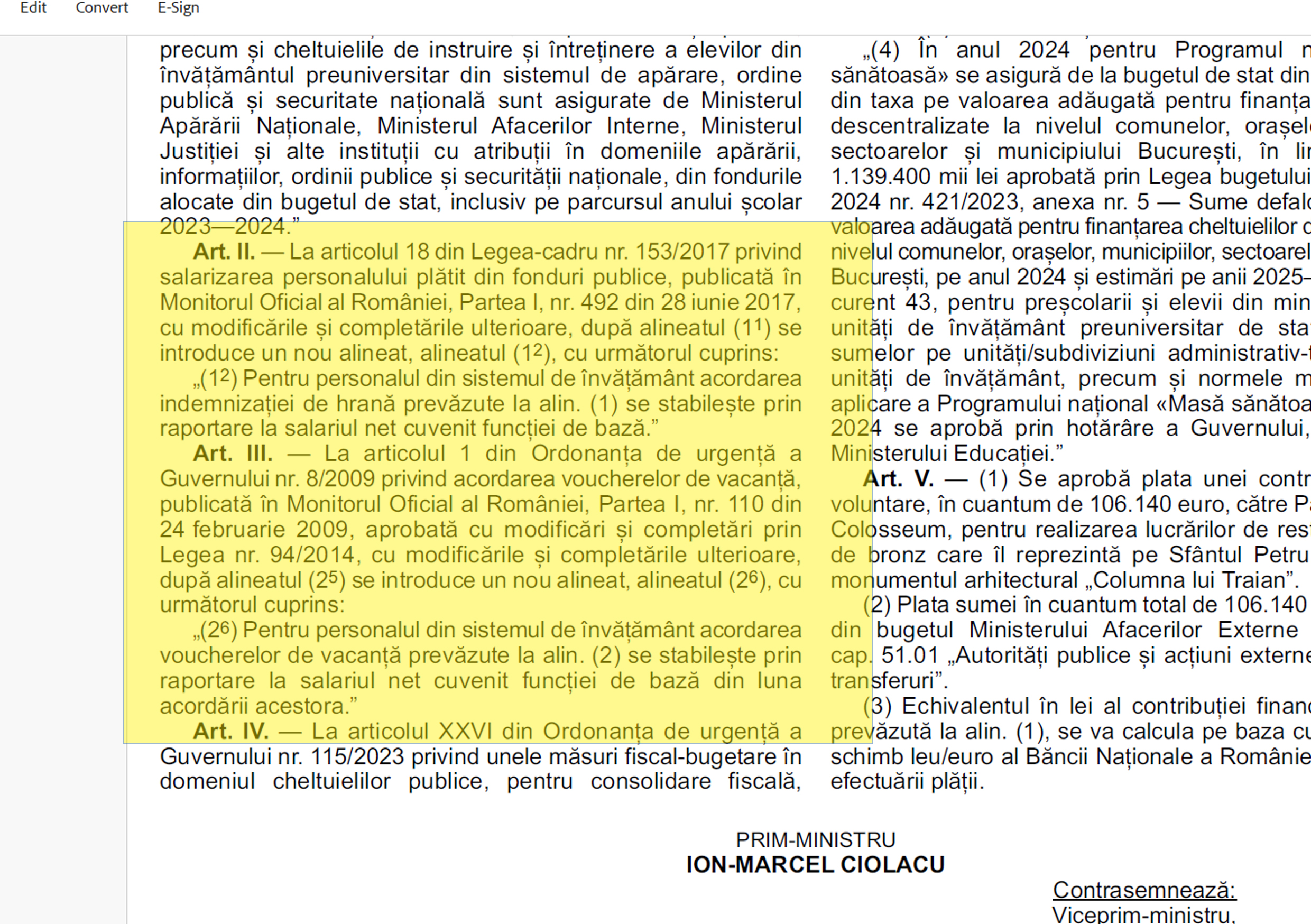 Guvernul a aprobat un proiect de Ordonanță de Urgență potrivit căruia indemnizația de hrană și voucherele de vacanță pentru angajații din învățământ trebuie să se calculeaze ținundu-se cont doar de salariul net cuvenit funcției de bază. OUG nr. 10/ 22 februarie 2024 a fost publicată astăzi în Monitorul Oficial nr. 160.